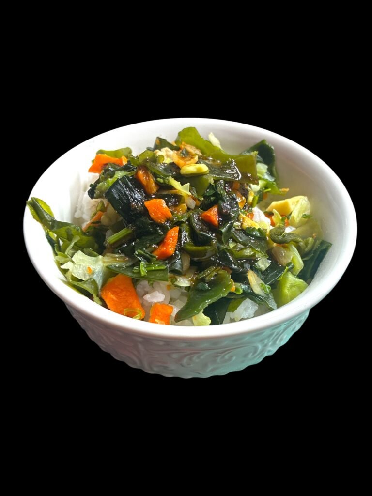 It is white sticky rice, topped with Asian miso soup vegetables. Not sure if this shows here, I see it doesn’t, but it was topped with Japanese BBQ sauce. Exceptionally good. It can be served really well with refreshing carrot, ginger, and turmeric juice.
